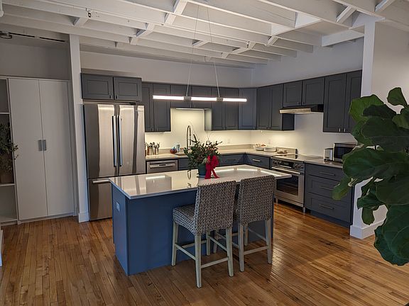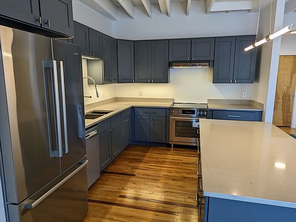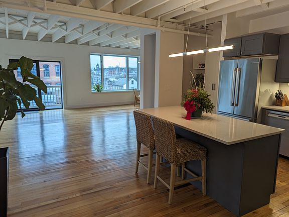 Live at the City's doorstep with a truly urban experience but close to all that the Midcoast has to offer. Park your car for weeks at a time because you can walk everywhere from this light-filled apartment. Historic details with modern amenities including tiled bathrooms with a primary suite wet room, refinished hardwood floors, and stainless steel Bosch appliances. This is a truly distinguished and unique space, measuring approximately 2,100 square feet. The stunning perch overlooking the Bath cityscape offers a small rooftop deck with southern exposure. Perfect for sun-loving plants and people alike, the south-facing picture windows offer views to the Kennebec River. The generous cabinet space and open-concept kitchen area is fit out with stainless steel Bosch appliances with quartz countertops and all-wood cabinets. The cozy living room and library nook with custom built-ins will be your go-to spot for entertaining or cozying up with a book. The primary bedroom is separated from the main living area with a pocket door. The "suite-like" primary bedroom has a large walk-in closet with built-in shelving, a full-sized front loading washing machine and dryer, and linen closet. It also has a wet room-style rainfall walk-in shower and tub, with a double sink & vanity. The guest bedroom or office has a closet and adjacent full bathroom with shower, with unique touches and beautiful finishes. Mini-splits (heat & cooling pumps) provide energy efficient heat & air conditioning in the fully insulated building. One dedicated, off-street parking space is available. Additionally, there is a large, lockable storage closet with built-in shelving exclusive to this unit. Tenant Responsibilities: Electricity (includes heat), water, sewer & hot water fees, internet, curbside City of Bath rubbish & recycling. Absolutely no smoking. Located on the third floor. A freight elevator will be available for move-in / move-out only. There is no passenger elevator. No dogs. Cats allowed. One parking spot comes with the unit. Landlord responsible for snow removal.