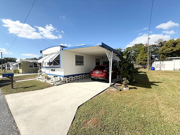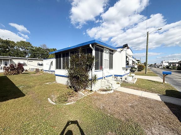 VERY WELL MAINTAINE HOME!! MOTIVATED TO SELL!! This home is located in the back of a quiet 55+ community with a lot rent of $615 a month which includes the use of the amenities! Some of the amenities include the use of the pool, shuffleboard, billiards and more! The water is billed through the community and runs less than $10 a month depending on usage. The average electric bill for this home runs anywhere between $75-$100 on average per month depending on usage. This park is in a great location and close to shopping, restaurants and medical facilities. This home has a metal roof. The roof was recently sealed (2024). The central AC/Heat unit is 3 years old (2022). The hot water heater is around 3 years old. The exterior of the home was painted 2 years ago and the homeowner just had the home power washed! The home was treated for termites in 2021 and the current homeowner hasn't had any issues or noticed any signs of them. The attached carport has room to park your vehicle(s). At the back of the carport you will find a nice size screen room where you can sip on a cup of coffee or a glass of wine while enjoying the winter weather. The storage shed is located at the back of screen room. The washer and dryer (fairly new) convey with the home. There is also lots of room to store your things. Enter the home from the screen room.... At the front of the home is an open concept with the living room and kitchen being open to each other. There are lots of windows allowing plenty of natural light into the home. The furniture in the living room is fairly NEW!! The kitchen was updated and has newer cabinets and counter tops. There is a door leading to a Florida room which could make a great sitting room, office or even a guest room when you have company. Head down the hallway toward the back of the home and find a small bedroom with a small built in wardrobe closet. Further down the hall is a nice size bathroom with a tub/shower combo. The larger bedroom is at the very back of the home and is nice in size with a closet and small wardrobe area where you can sit and get ready or use as a computer desk! All of the floors in the home are laminate throughout giving the home a nice flow. COME SEE THIS HOME TODAY!!!