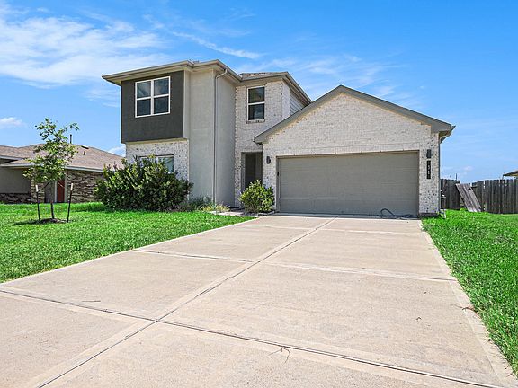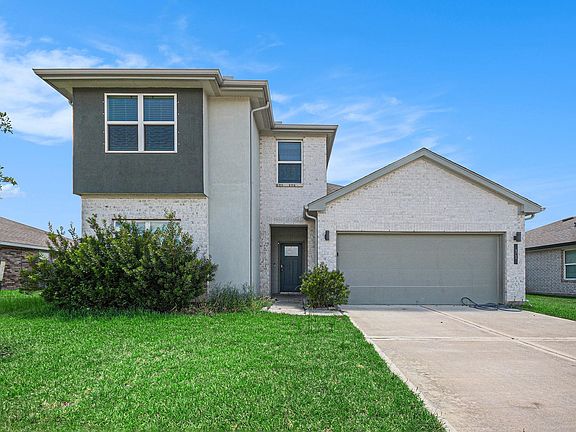 4-bedroom, 3-bath home in Manvel with spacious yard and modern layout. Open living area features wood-style floors and natural light, flowing into a kitchen with gray cabinetry, stainless steel appliances, sleek counters, and large island. Main suite includes double sinks, soaking tub, and separate shower. Three additional bedrooms and two full baths add flexibility. Includes washer/dryer and 2 driveway spots. Near schools, Hwy 6, Hwy 288, and Houston.
