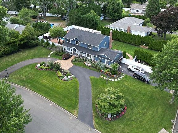 Welcome to this truly magnificent one-of-a-kind center hall colonial in the sought after Village on the Hill Section of Dix Hills with a resort-style entertainers oasis. This smart home features 4 BRs, 2.5 Baths, and was stunningly updated with the highest level of designer luxury. Upon entering this two story formal entry way, you will be greeted with timeless architectural character with contemporary elegance. The spacious open floor plan features a chefs style designer kitchen with custom shaker style cabinetry, quartz countertops with abundant space for all of your culinary needs. Enjoy your Viking 6 burner natural gas stove/oven, pot filler, oversized Sub Zero custom wood paneled refrigerator. You’ll find a nicely sized center island with additional storage, microwave and seating. Along your kitchen dining area you will conveniently find the coffee bar and wine/beverage fridge which is perfect for entertaining. The kitchen flows into a cozy den area with a stone wood burning fireplace all tied in with radiant heat porcelain wood-look flooring. Double French doors lead you into a media/livingroom with a large electric fireplace under an oversized TV with full surround sound speakers. The formal dining room is adjacent to the kitchen with coffered ceiling and wainscotting. Upstairs you’ll find your Primary spa-inspired bedroom/bathroom with radiant heat, frameless glass oversized shower stall, double sink vanity with matching Robern LED/defrost medicine cabinets and designer finishes. The laundry room is located in the upstairs hallway. Additionally, there are three nicely sized bedrooms and a full updated bathroom with tub/shower. On the lower level you will find a finished basement which includes 2 split ac/heat systems which offers incredible flex space, gym, entertainment TV area and a separate storage room. A one-of-a-kind backyard is a true entertainers delight. No detail spared! The L-shaped gas heated salt-water pool is surrounded by 5000 sq ft. of brick pavers for resort style living and leads to the full outdoor covered patio with year-round Bromic heaters, and full outdoor kitchen with granite & stainless XO/Kitchen Aid appliances (all natural gas). Additionally, there is a 10x14 concrete slab fully plumbed with separate cesspool in yard for future pool house, amazing greenspace and 2 sheds. Professionally landscaped corner property offers lush privacy, with mature frontage and year-round color. Prominent features include, crown moulding throughout, 2 separate driveways, large circular driveway and additional side driveway to the garage. 5 zone heating, 3 zone AC, 150 amp with an additional 100 amp panel, all natural gas, 6 zone sprinklers, front and back surveillance cameras, cesspool, Generac whole house 22K generator. Smart features include smart switches, strategically placed outlets and LED lights throughout for your convenience to control your home from your phone, apps or verbal commands. Half Hollow Hills SD #5- Vanderbilt Elementary, Candlewood Middle School, HHH West High School. Near all. This one-of-a-kind gem won’t last!!!