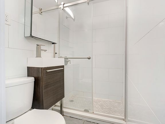 The sun-drenched living room enjoys (rare) corner exposure, offering breathtaking unobstructed views North onto 2nd Avenue. Ornamental fireplace, exposed brick, custom pewter ashe hardwood flooring and LED lighting throughout. The gorgeously renovated bathroom is finished with premier floor-to-ceiling Carrera marble tile, custom glass shower doors with brushed nickel track and motif, LED strip lighting and London grey self-closing vanity with recessed glass medicine cabinet.