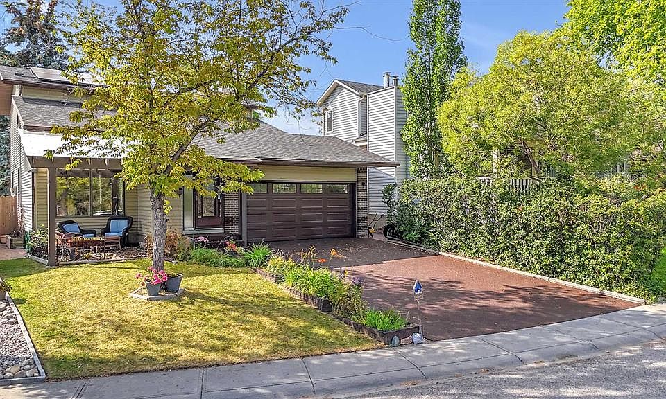 Welcome to the highly sought-after community of Scenic Acres! The location of this charming home couldn’t be better as it’s situated directly across from a large park, a short distance from top-rated schools, Crowfoot and Silver Springs shopping centers, a 10 minute walk to the LRT station, and all of the essential amenities that you could ask for. With 1,635 square feet of character and warmth, this home features 3 spacious bedrooms and 3 bathrooms, a double attached, heated garage and a great list of updates. Situated directly across from a large park, enjoy tranquil views and serenity at your doorstep. The curb appeal on this home is fantastic with the inviting front porch, covered pergola, and lush garden beds. As you step inside, you’re greeted by a soaring vaulted ceiling, and the warmth of laminate plank floors. Natural light flows through the large front windows illuminates the living and dining room. The kitchen is well equipped with maple cabinetry and a cozy breakfast nook that overlooks like picturesque backyard. Adorned with a classic wood burning fireplace and attractive built-in shelving, the family room makes for the perfect spot to relax, entertain guests, or enjoy the outdoor living space through the patio doors. You’ll love the west facing, dream backyard that’s filled with mature trees, plants, shrubs and flowers. The sizeable patio area is a great spot for bbqs, sipping on your morning coffee, or simply enjoying the peaceful ambiance under the retractable awning. On the second level of the home you’ll discover 3 generously sized bedrooms. The primary bedroom overlooks the backyard and has a 3-piece ensuite. Finishing off this area is a 4-piece main bathroom with skylight for natural light throughout the day. The basement is filled with potential to mold it to suit your unique lifestyle. It has a large rec room that can be setup in a variety of ways as a home theatre, media area, hobby/crafts room, or play space. With plenty of storage space, there’s incredible amounts of utility on this level. Additional upgrades to the home include a brand new rubberized driveway with 5 year transferrable warranty, 13 energy efficient solar panels, 2 furnaces installed in 2020 and an irrigation system. This home is not just a place to live, it’s a lifestyle waiting to be embraced. Don’t miss out on this fantastic opportunity — schedule a viewing today!