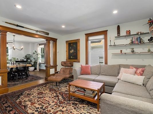 Step into this beautifully maintained Colonial seamlessly blending classic charm with modern amenities. The inviting foyer leads to a spacious eat-in kitchen with hardwood floors and slider to rear deck overlooking yard. Enjoy meals in the formal dining room connected to a cozy living room by a classic column archway. A mud room at the side entrance holds a coat closet and a 3/4 bath to complete the first floor. Upstairs, you'll find 3 bedrooms with ample closet space and a full bath. Outdoors, the fenced yard is a haven for relaxation and entertainment, complete with a deck, patio, and plenty of space for gardening. The sun-filled front enclosed porch is the perfect spot for an office with space to unwind and watch the world go by. Recent updates include appliances and updated baths, ensuring modern comfort in a home with period details. Nestled in a quiet neighborhood near Legion Field, this home is truly a gem. Don't miss out!