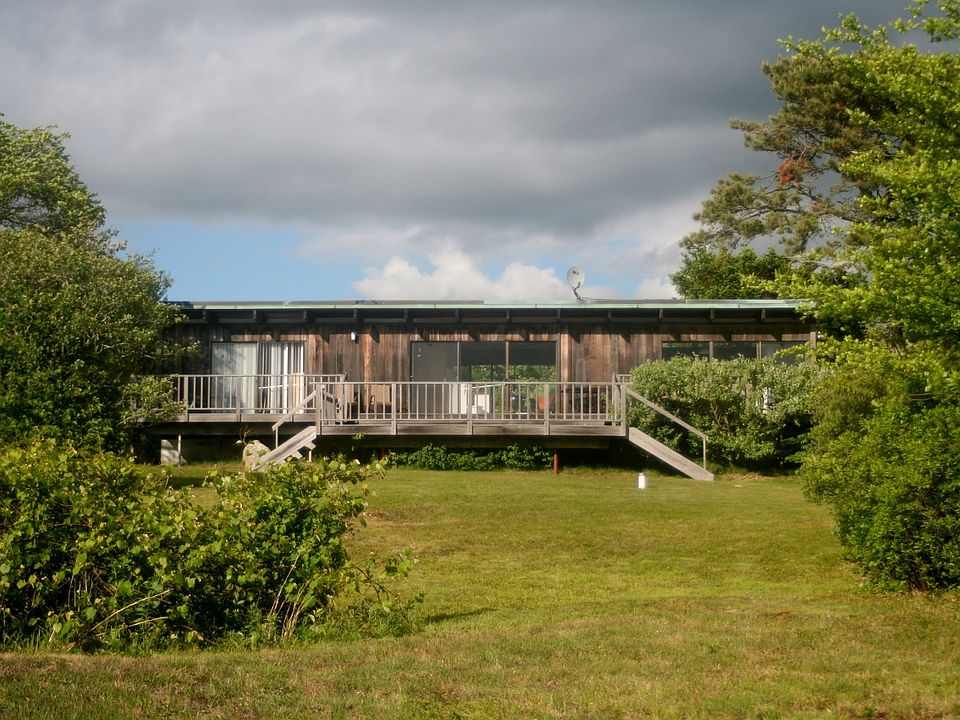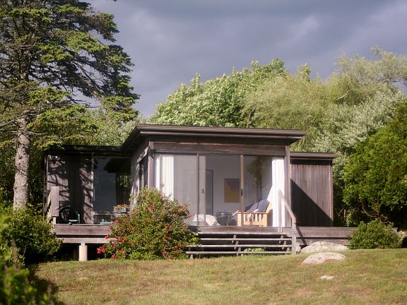 Gracious two-acre property, with gurgling brooks and a large scenic pond graced with water lilies on Menemsha's picturesque Flanders Lane. It offers one of Martha's Vineyard's most spectacular views, from sunrise to sumptuous sunsets over Menemsha Pond, the Vineyard Sound and even glints of the Atlantic Ocean. The property is secluded and peaceful, undulating land full of wild grapes and blueberries, beetelbung trees, and sculptural boulders, near wooded jogging trails. It is within walking distance of private beach and boat-launching spot and the picturesque harbor, town beach and fish markets of Menemsha village. A quaint wooden bridge separates two houses on either side of the pond. The main house is a flat-roofed, Japanese style mid-century classic designed by prominent post-War architect William Smull. It has a large deck, a nearly all-glass facade perfectly positioned for maximum views, two bedrooms, two baths, a galley kitchen, and large living room equipped with modernist fireplace, lined with warm cedar throughout. Potential to modernize and maximize value with ingenious design.The guest house on the other side of the brook is entirely private, self-contained, with two glassed-in rooms, kitchen, and bathroom, plus a deck that shares the gorgeous view. A great opportunity to own a uniquely beautiful property. View photos on facebook Mid Century Modern Gem.