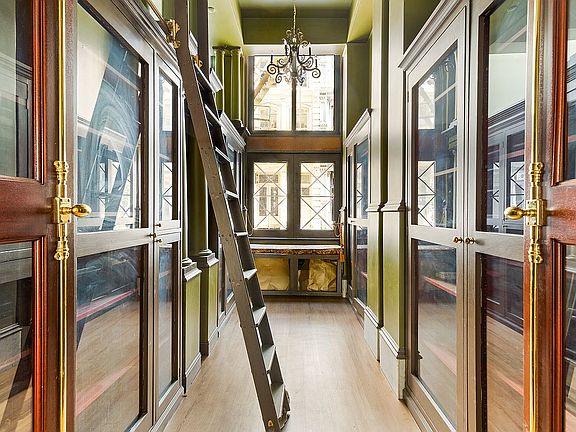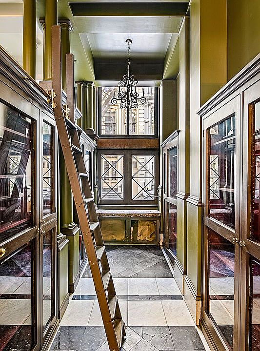 A unique multi-level library/office with a ladder to a small loft offers flexible use as a guest area or study. The loft’s layout is perfect for live-work setups, showrooms, or even an art gallery.