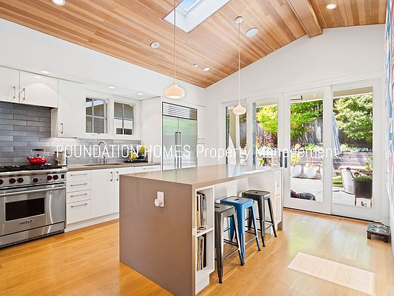 As you step through the second-floor front door, you'll be greeted by an open and luminous living area adorned with soaring vaulted wooden ceilings, complemented by operable skylights that infuse the space with natural radiance. The centerpiece of the living room is a gas fireplace flanked by floor-to-ceiling built-in shelves, creating a captivating focal point that exudes sophistication. Flowing seamlessly from the living room, the dining area offers a wet bar complete with a wine fridge and sink, enhancing the entertainment experience.
