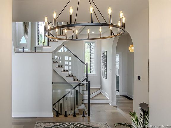 Where modern design meets everyday comfort, this remarkable home blends architectural design with an inviting sense of warmth & livability. Soaring ceilings & a striking fireplace set the tone in the great room, while a wall of windows fills the space with natural light & serene lake views, the perfect backdrop for gatherings & quiet evenings. The kitchen is a showpiece of style & function, featuring smart appliances, custom cabinetry, a large island & a hidden walk-in pantry that surprises & delights. The dining area easily accommodates family dinners or festive entertaining, all within an open, flowing design. Your main floor primary retreat offers true privacy with its own fireplace, a spacious walk-through closet & a spa-inspired ensuite where every detail invites relaxation. The stunning glass-panel staircase adds a designer touch as it leads to the upper level with 3 generous bedrooms, a beautifully organized laundry room & a light-filled gallery perfect for reading, reflection or creative space. The finished walk out level adds even more flexibility; ideal for a media room, home office or a welcoming suite for extended family, complete with kitchenette & full bath. An oversized garage & a large, naturally buffered lot invite you to create the outdoor retreat of your dreams with minimal maintenance. Steps from your door, cross Heritage to join the Ritchie Lake trail, a scenic pet-friendly path where you can unwind & enjoy the natural beauty of Quispamsis right at home.