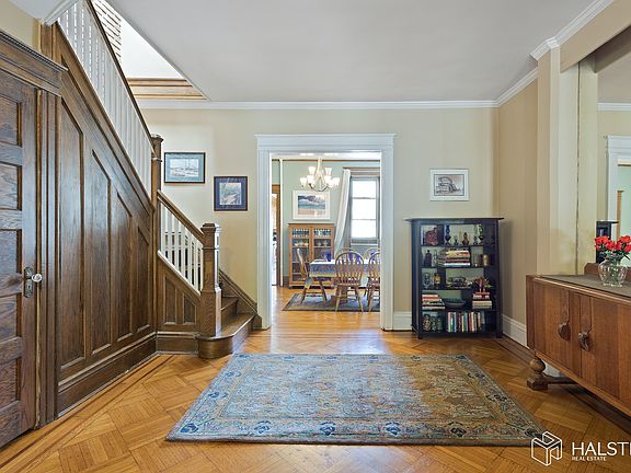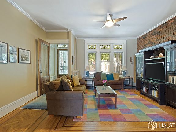 Relax on your full-width front porch on the bucolic Howard Place, setting of the movie "As Good as it Gets." The one-block long, one way tree-lined street is truly idyllic. Do you like original details combined with modern upgrades? Light streaming in? Then this charmer is for you! Main level features stained glass transoms over the windows and front door, spacious living room, second parlor, formal dining room and eat-in chef's kitchen. Cherry cabinetry, granite countertops, new stainless appliances and recessed lighting adorn this inviting spacious kitchen. Upstairs you will find 3 bedrooms, including the bay-windowed full-width master, two additional bedrooms, full bath and two extraordinary stained glass skylights. Basement has a huge playroom/den, an office/gym/crafts room and a half bath once used as a full bath. The backyard is a great place for barbecuing, gardening or lounging in the sun. The F and G trains (15th St./Prospect Park station) are on the corner. Shops, restaurants and all kinds of services are around the corner on Prospect Park West. Two blocks away is Prospect Park, an urban oasis for every kind of outdoor activity!