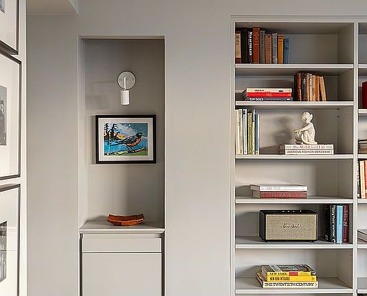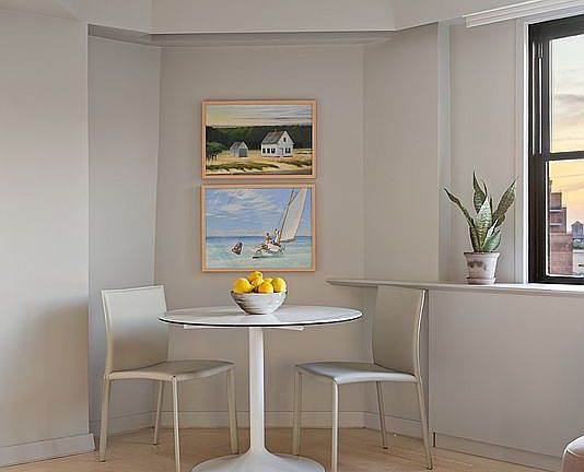 This pristine move-in ready residence combines a coveted historic district location with sleek contemporary interiors designed by Lynn Gernert Architects and interior designer Erik R. Smith. Tall ceilings, cove lighting and crisp white art walls are joined by pale hardwood floors and teak built-in cabinetry. A large foyer with a coat closet ushers you into the gracious living/dining room, perfect for relaxing and entertaining alongside a wide west-facing window. Thanks to its position on the 16th floor of one of the tallest buildings in the West Village Historic District, the home enjoys unobstructed vistas that stretch across the Hudson River to the Hoboken and Jersey City skyline. The beautifully appointed windowed kitchen maximizes storage and style with white cabinetry, marble countertops and upscale appliances by Gaggenau, Sub-Zero and Miele.
