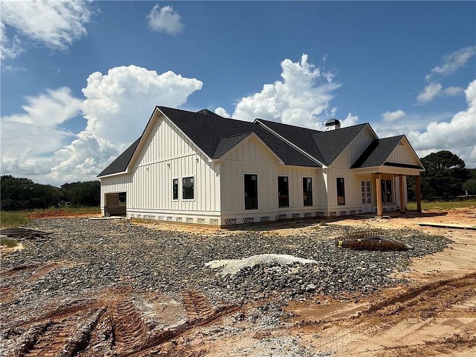 LAKE FRONT PROPERTY sitting beautifully on Lake Jane. NO HOA....new home under construction is the Rosehill floorplan, 4 BR/3.5 BA beautiful Farmhouse Ranch style home on 5.42-acre lot. This home is built on a slab with beautiful features including a stone water table on all four sides with stone accents, black window package, hardi plank siding, rear side entry with 18 ft garage door with opener, 30 Year architectural shingles, 5" gutters. Kitchen with large walk-in pantry, beautiful upgraded wood inset cabinets, island, farmhouse sink, quartz countertops in the kitchen and master bath, granite countertops in the baths, beautiful Cafe brand stainless-steel appliances including a range, dishwasher, microwave AND refrigerator. Dining Room with 10 ft ceilings, Spacious Living Room with fireplace and open concept plan,Office, split bedroom plan,finished bedroom with full bath upstairs, ceramic tile flooring in baths, hardwood flooring throughout. Master bathroom has his/her split double vanity, ceramic tile shower, huge walk-in closet. Upgraded closet systems throughout. This home will feature a 12 ft dual bifold door (3 pane sliders each 4 ft in size that will give you an open 12 ft door area) that opens to the covered rear back porch area with flag stoned flooring with a breathtaking view of the lake. Closing attorney is Bagby Law in Dallas, GA. When using the preferred lender, Marybeth Zimmerman with SWBC Mortgage the buyer will receive a $3,000 credit towards closing costs from lender*****Builder may make changes/substitutions****. *****plan shown is rendering and some changes made be made by the builder****.
