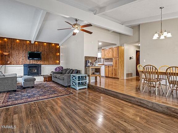 Welcome to this adorable Naches home surrounded by beautiful orchards-offering the perfect mix of country charm & modern comfort. The vaulted/beamed ceilings create a spacious & welcoming family room & the cozy warmth of the pellet stove, make it such an inviting space. The updated kitchen opens to the large dining room. Don't miss the updated bathroom! Enjoy the fully fenced yard (recently seeded with grass) w/ an automated sprinkler system & a covered patios-perfect for relaxing evenings & entertaining. The large 2+ car garage/shop offers tons of storage & work space; as well as a wood stove, plumbing for a bathroom and a separate office. There is tons of parking for vehicles, RVs or toys. This home has a private well, private septic, an electric furnace & central air. Peaceful rural living, just minutes from town can be yours! Don't miss your chance to make this adorable, well-cared-for home your own!
