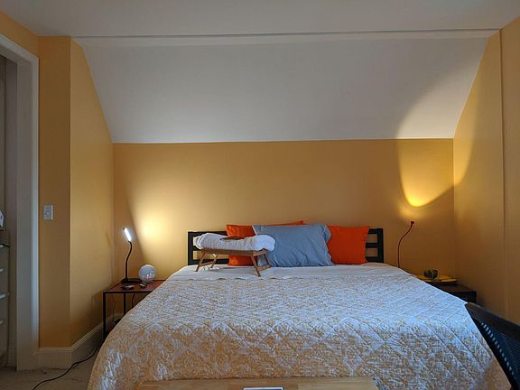 Fully furnished master bedroom and bath with king bed and a walk-in closet. A minute away from Brighton's main street and public transit. Shared kitchen, but currently no other tenants occupying rooms on the master bedroom floor. Hi, all! My partner and I moved to Boston hoping he'd be able to attend classes in person at BU. We moved into this charming space on September 1st and have been thrilled to live here, but as time has gone on, my partner hasn't been able to attend any classes in person and won't be able to for the foreseeable future. We've been feeling homesick and lonely as we moved without family and have no contacts here. As such, we want to move back home and need an individual to take the space under a new lease arranged through our broker. We've talked with our broker and she's agreed we can arrange the situation. You would be getting the master suite on the third floor with a private bathroom and large walk-in closet. The space is furnished with a bed, dresser, and desk. Currently, there are no other tenants on the third floor, leaving it open and private. The roommates on the second floor are quiet and kind, and there's even a quaint patchwork yard in the back with a lovely tree to sit under and space for parking if you have a car. Rent is $1,500/mo. and includes utilities. The property is close to Boston University and Boston College, just a bus or bike ride away. Additional Notes: -rent includes utilities -The house is composed of two units, one on the first floor and one on the second and third floor (Unit 2) -Unit 2 has 6 rooms, 3 on the 2nd floor, and 3 on the third floor, including this master bedroom -currently no other tenants are on the third floor! -1 GB internet (extremely fast) -plenty of parking in back driveway -king bed -the apartment comes furnished -minute walk from nearest closest bus stop -near a church and Brighton police station, so low crime unsurprisingly -back patio -garbage disposal in kitchen sink -small yard -walk-in closet -great third story view -silverware and other kitchen necessities are available from past tenants in solid condition -vacuum cleaner included if desired -the current tenants will personally help you with the process with the broker if desired