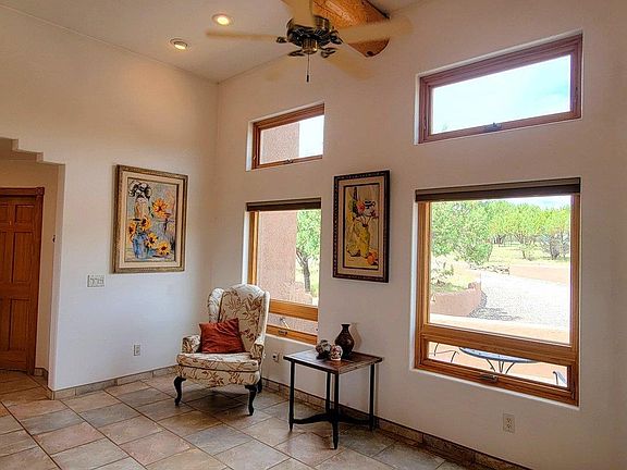 A True Southwest Sanctuary: This beautiful, one-owner, 3-bedroom, 2-bathroom home offers a private retreat on 3.6 acres in the highly sought-after Dos Griegos 4. Craftsmanship and thoughtful design are evident throughout, from the open-concept floor plan with large view windows to the lighted nichos perfect for displaying your art. Enjoy panoramic mountain and valley views from every angle. The split floor plan ensures privacy, separating the primary suite with its cozy gas fireplace from the two additional bedrooms and dedicated office. A kiva-style fireplace anchors the living area, while the custom kitchen flows seamlessly for easy entertaining. Outdoor living is a dream with two semi-enclosed patios. The back patio features a fireplace, perfect for enjoying sunsets and stargazing. The property also includes a 4-car garage with a separate workshop, RV space with hookups, and a metal roof. This is more than just a home; it's a slice of Southwest paradise.