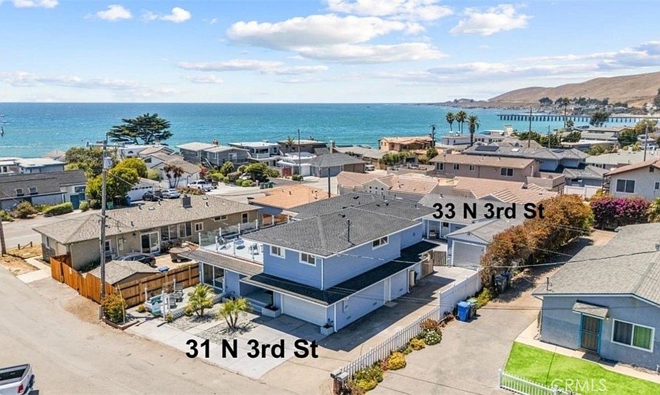 Welcome to 31 & 33 N. 3rd Street in the heart of the beach town of Cayucos — a rare and glamorous coastal investment ready retreat featuring two fully renovated homes on one expansive ocean-view lot just steps from the sand. Designed with a refined sense of modern beach glam, the main residence offers 4 bedrooms and 3 bathrooms with 2218 square feet across a bright, open-concept layout filled with warm wood tones, solid redwood construction, and thoughtfully curated designer finishes. The custom kitchen is a standout with caramel-colored MasterCraft cabinetry, Taj Mahal quartzite countertops and full backsplash, large eat-in island, and Bosch dual-fuel stove. A stunning ridged farmhouse sink, instant hot water, and built-in wine/coffee bar add beauty and function. Entertain on the new 40-foot roof deck with full-glass railings or relax on the new front entertainment deck. Inside, enjoy double-pane windows, new lighting, new flooring, upgraded central heating system, and separate laundry areas upstairs and in the garage. The spa-style primary suite features a soaking tub, walk-in shower, and double vanity. The garage is finished with built-in cabinetry, workspace, and space for a second fridge, and there is a Culligan owned water filtration system and new roof.