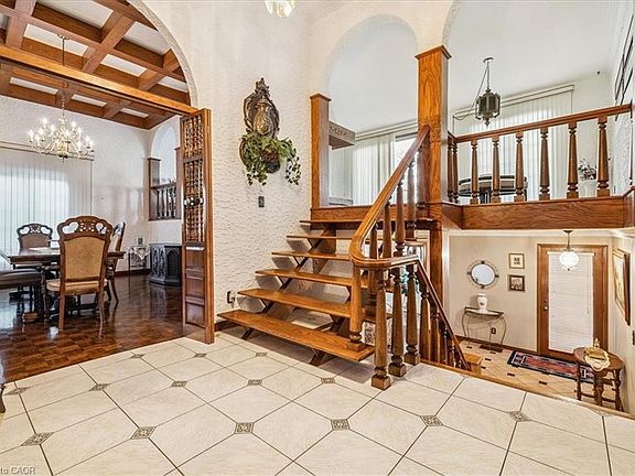Welcome to this one-of-a-kind, character-filled residence nestled in a quiet court at the base of the Niagara Escarpment in the heart of Stoney Creek. This custom-built home is a rare gem, showcasing timeless craftsmanship and architectural charm rarely found today. From its stately brick exterior to the multi-tiered concrete balcony offering scenic escarpment views, every detail tells a story. Inside, you’ll be captivated by the soaring ceilings, exposed oak beams, elegant plaster walls, arched openings, and the beautiful open-riser staircase connecting each level. The grand dining area exudes old-world sophistication, perfect for gatherings and entertaining. With two full kitchens, two full baths, and a separate lower-level entrance, the layout easily accommodates an in-law or multi-generational setup. Updates include the roof, furnace, air conditioning, and windows, ensuring comfort alongside classic curb appeal. A truly distinctive home offering enduring beauty of thoughtful design in the kind of home that simply can’t be replicated today.