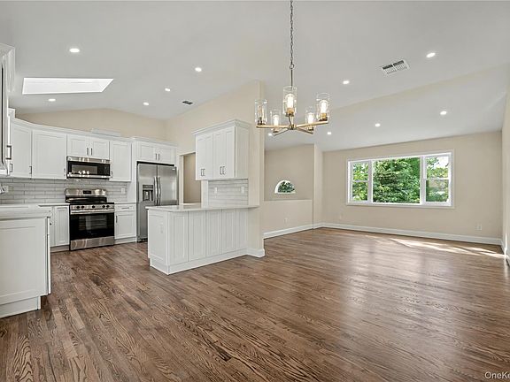 Welcome to this stunning 5-bedroom, 3-bath Hi-Ranch, fully renovated from top to bottom. Step inside to soaring vaulted ceilings and skylights that fill the home with natural light. The open-concept layout features a brand-new kitchen with sleek stainless steel appliances, perfect for both everyday living and entertaining. Every detail has been thoughtfully updated—new siding, windows, plumbing, electrical, and central air—giving you peace of mind for years to come. With 5 spacious bedrooms and 3 modern bathrooms, there’s plenty of room for family, guests, or a home office. Set on the last lot of a quiet dead-end street, this home offers both privacy and convenience. Move right in and enjoy the perfect blend of style, comfort, and location.