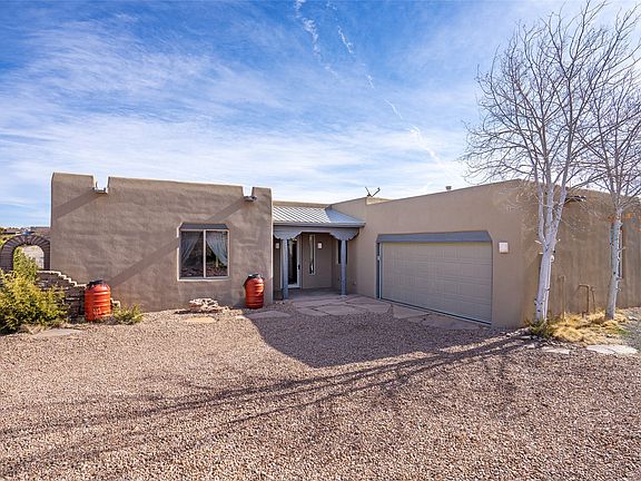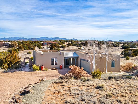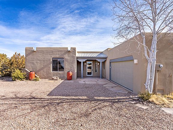 Lovely 3 bedroom, 2 bathroom Eldorado single level home on the highly desired Quedo Road. This Pueblo styled property sits on 1.23 acres and is located at the end of a cul de sac. Nice Santa Fe touches with vigas, nichos, a kiva fireplace and adobe brick accents on the interior and exterior. Covered, back portal looks unto the greenbelt. Enjoy the tranquility and night skies on the flagstone patio. New radon mitigation system installed in 2024, new Weil Mclain boiler installed in 2022, newer stucco, roof maintenance and hot water heater done in 2021. Attached 2 car garage. This home has ceramic tiled floors throughout; no carpet! This gem is not to be missed. Eldorado has sensible HOA fees and so much to offer including trails, community center, outdoor pool, pickleball courts, dog parks plus The Agora Shopping area is nearby.