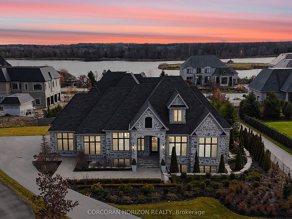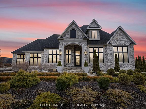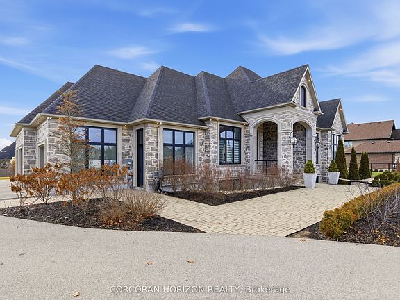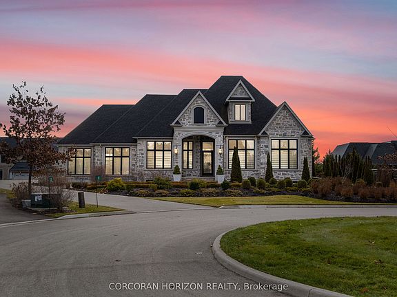 Welcome to 31 Reid Court, a stunning luxury bungalow located on a 1/2 acre lot in the prestigious Heritage Lake gated community. This residence offers an exceptional blend of elegance, comfort and masterful craftsmanship. The main level features soaring twelve-foot ceilings and an open-concept kitchen, living and dining space filled with natural light. The chef's kitchen is equipped with a Sub-Zero paneled fridge and freezer, a Thermador paneled dishwasher, an industrial Thermador stove with a custom range hood, a large island with seating and storage, and a paneled Marvel beverage fridge for added convenience. The living room is centered around a striking marble fireplace, and upgraded designer lighting throughout enhances the home's sophisticated ambiance. The primary suite serves as a private retreat, offering a generous walk-in closet and a spa-inspired ensuite with double sinks, a deep soaker tub and elegant marble finishes. Heated floors extend through the primary ensuite, the second main-floor bathroom and the laundry room. Two additional spacious bedrooms complete the main level. The fully finished basement impresses with ten-foot ceilings and features a dedicated home theatre with a Sony projector and an approximately one-hundred-fifty-inch screen, an expansive rec and living area with a fireplace, and three additional large bedrooms. Additional highlights include that the home is Net Zero ready, has a Sonos sound system with Triad speakers on the main level and wiring for future expansion, a 2020 Generac generator and home security system. Outside, a spacious backyard with generous greenspace and a covered outdoor living area with a built-in fireplace creates the perfect setting for entertaining. Paired with quick access to surrounding conveniences, this home delivers effortless luxury in a peaceful, sought-after location.