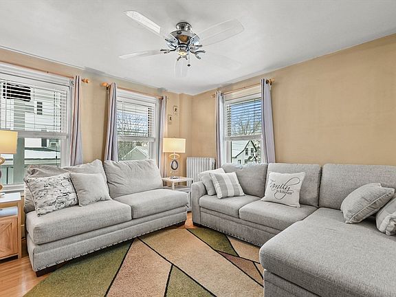 Charming 2-bedroom, 1-bath home in the sought-after Cottage Park area of Winthrop! Cozy new front porch leads you into an inviting living room w/ gleaming HW floors & plenty of natural light. The dining room, featuring a custom built-in china cabinet w/ 3 drawers for add'l storage, flows seamlessly into the kitchen w/ ample cabinet space, tile flooring & a breakfast bar. Enjoy new SS smart appliances & the new glass slider w/ internal blinds that opens to your private backyard & patio area. Upstairs, both bedrooms are equipped w/ vaulted ceilings, HW floors, skylights & spacious closets. The updated full bath boasts a skylight, gorgeous tile flooring & a beautifully tiled shower & oversized newly resurfaced. Lower level provides extra storage & laundry for added convenience. Fenced-in yard perfect for outdoor relaxation. Located just minutes from Winthrop Golf Club, Winthrop Center, the ocean, this home offers the perfect combination of modern amenities, comfort & convenience!
