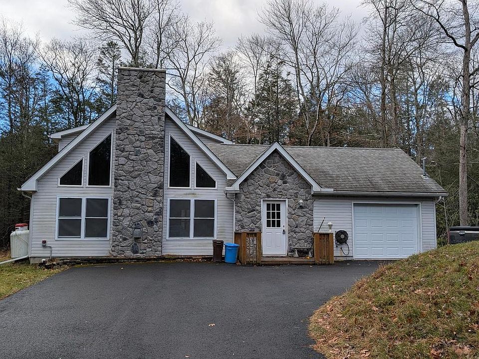 Attention investors, contractors and "handy" vacation homeowners. Opportunity knocks in Holiday Pocono! CASH offers only! Home is being sold in "AS IS" condition! This stunning A-Frame home in the desirable Holiday Pocono community offers a perfect blend of comfort and nature. With 4 spacious bedrooms and 2 full bathrooms, the interior features an inviting dining area and an eat-in kitchen, ideal for gatherings. Enjoy cozy evenings by the stone fireplace, while energy-efficient double-pane windows provide ample natural light. Set on a generous 5-acre lot that backs to serene woods, this property boasts breathtaking mountain views and a variety of outdoor spaces, including a screened porch and expansive deck. The community amenities include lake privileges, a clubhouse, picnic areas, and playgrounds, fostering a vibrant neighborhood atmosphere. Conveniently located near top-rated schools and parks, residents benefit from well-maintained common areas and security gate access. With an attached garage and ample parking, this home is a perfect retreat for those seeking tranquility and community engagement. Experience the best of both worlds in this beautiful setting!