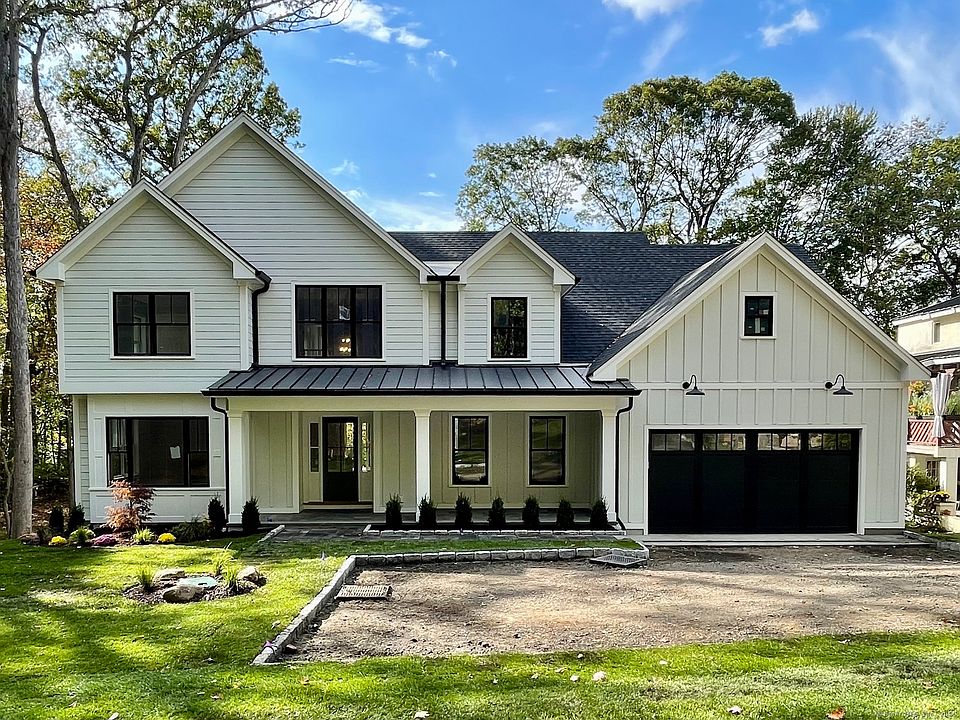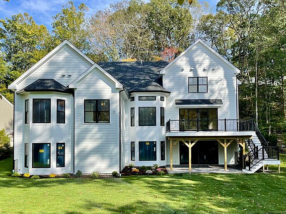 New construction at the end of a quiet cul-de-sac in Stamford's desirable Mid-Ridges, 31 Rosano offers 3,900 sq ft of living space with privacy, convenience, and contemporary design. The exterior showcases crisp white siding with bold black windows for a clean, architectural profile. Professionally designed landscaping with a full irrigation system completes the look and keeps upkeep simple for the new owner. A walk-out lower level opens to a flat backyard with a patio and upper deck, creating seamless indoor-outdoor potential. Inside, the open layout highlights a striking kitchen with a bold island, custom cabinetry, and quartz counters. Hardwood floors, detailed millwork, and tray ceilings create a timeless foundation, while mixed metal finishes add a sleek, transitional edge. The main-level primary suite features a walk-in closet and spa-like bath with an 8' vanity, soaking tub, and curbless shower with bench seating. Upstairs, four bedrooms include two en-suites and a Jack-and-Jill bath, each with frameless LED mirrors and designer finishes. The unfinished walk-out lower level offers 2,000 sq ft with 9' ceilings-ready for a gym, media room, play area, or wine cellar. Close to top schools, transportation, restaurants, and amenities, 31 Rosano is new construction in a peaceful, must-see setting-move-in ready and designed for modern living.
