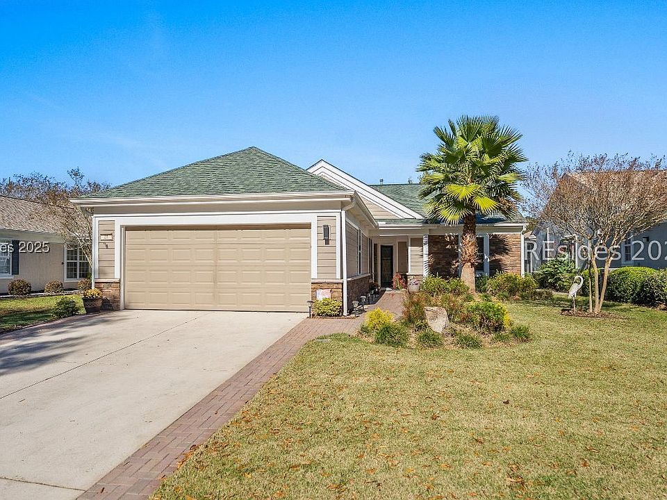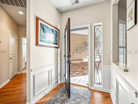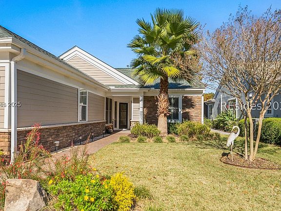 Stunning Lagoon-View Home in Sun City Hilton Head - Over $100K in Upgrades! Welcome to this beautifully updated 2-bedroom, 2-bath Egret model with an office and Carolina room, perfectly situated on a private lagoon lot in the highly sought-after Sun City Hilton Head community. Every inch of this home has been thoughtfully enhanced with over $100,000 in upgrades, offering comfort, quality, and style. Inside, enjoy engineered hardwood floors throughout and an open, inviting layout. The gourmet kitchen features leathered granite countertops, upgraded stainless steel appliances, and a cozy breakfast nook, along with a separate dining area for entertaining. The primary suite is a true retreat with a totally remodeled bathroom showcasing a huge walk-in shower, tall counters, and new cabinetry.An automated shade on the double window adds convenience and a touch of luxury. The office with built-in shelving provides the perfect workspace or reading area.Enjoy effortless indoor-outdoor living with a 16' x 16' screened lanai and a newly installed 24' x 15' pergola patio, ideal for relaxing or hosting guests. The oversized two-car garage features epoxied floors, offering both durability and style. The garage also features a fully retractable screened door making it a great work space or fitness area, or rec room. The front door features a retractable built in screen door. Outside, the home shines with new Hardiplank siding and stone accents, replacing the original stucco for added beauty and peace of mind. This property combines elegant design, thoughtful upgrades, and serene lagoon viewsall in the heart of one of the Lowcountry's premier active adult communities. Experience luxury living in Sun City Hilton Head when you schedule your private showing today!