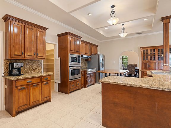 Set on over 6 acres, this impressive 5-bedroom, 5.5-bath home offers more than 5,000 square feet of living space, a full Austin stone exterior, and a 3-car garage. Ornate double front doors welcome you into a grand foyer, flanked by a formal living room and a formal dining room. A stone archway leads into a spacious den with a built-in stone media center and matching fireplace, seamlessly opening to the chef’s kitchen. The kitchen features an oversized island with extended bar seating, abundant cabinetry, a massive walk-in pantry, and a private office just off the breakfast nook. The luxurious primary suite includes a private sitting area, a second office or flex room, dual walk-in closets, and a spa-like bath with double vanities, a walk-in shower, and a soaking tub. Hardwood and tile flooring run throughout the home, adding warmth and style. A separate guest suite with a full bath is located off the garage—ideal for visitors, extended family, or a private retreat.