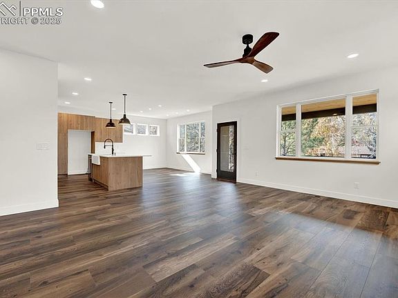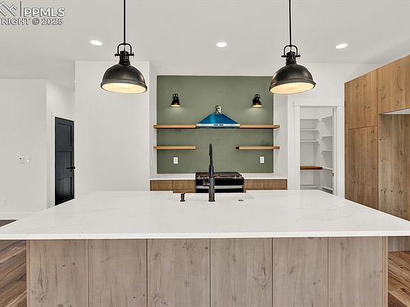 Discover this brand-new, custom-built, Mountain Modern-style home nestled in an established neighborhood known for its mature trees and scrub oak. This is a rare find—a newly constructed home offering the peace and space of a developed community with NO homeowner's association (HOA)! The spacious living room is anchored by a cozy gas fireplace, perfect for relaxing evenings. The home boasts custom touches throughout, including elegant white oak flooring, stairs, and windowsills. The gourmet kitchen is a chef's delight, featuring an eight-foot center island with lower cabinetry, a classic farmhouse sink, and stainless-steel appliances, including a dishwasher and vent hood. Attractive floating shelving and cabinet drawers flanking the gas range. A large walk-in pantry provides ample storage and includes an additional power supply for a microwave or other appliances. The expansive kitchen and dining area offer plenty of space for entertaining guests. Take in Pikes Peak and mountain views from the covered composite deck, framed by beautiful Douglas Fir accents. Outside, you'll appreciate the low-maintenance yard and a large driveway with ample parking leading to the oversized one-car garage. Enjoy the nearby walking and biking trails for easy outdoor access. The home includes a luxurious large primary suite that easily accommodates a king-sized bed. The accompanying bathroom features two separate vanities, a private toilet area, a large walk-in shower, and a substantial walk-in closet. A convenient office near the front door, complete with a large, bright window, is perfect for working from home. The lower level also includes a full bathroom with a shower. For modern convenience, the home is pre-wired with ethernet and cable and includes air conditioning. Don't miss this exceptional opportunity to own a unique, custom, and brand-new home in a sought-after, established location!