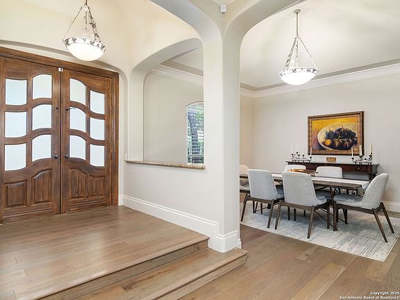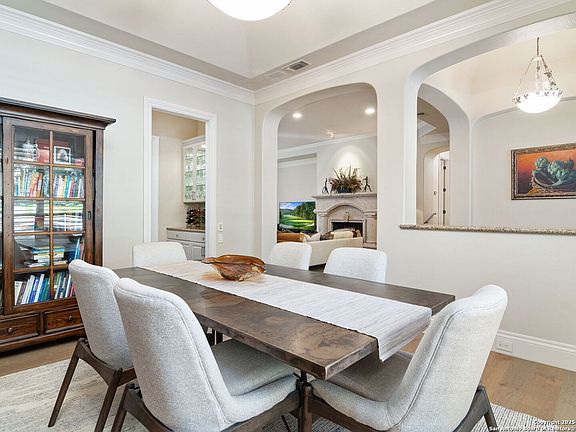 Experience refined living in this exceptional Dominion residence, thoughtfully built by Kenigstein and ideally situated near the country club. Every detail reflects a commitment to craftsmanship and quality, blending timeless sophistication with modern comfort. The inviting kitchen features expansive counter space, deluxe stainless-steel appliances, and a butler's pantry, seamlessly opening to the breakfast area and family room adorned with a Cantera stone fireplace. Natural light fills the open living spaces, creating an atmosphere that feels both elegant and welcoming. The serene primary suite offers generous space and a spa-inspired bath with luxurious finishes. A secondary bedroom with a full bath is conveniently located on the main level, while upstairs includes a spacious guest bedroom, home office/study, and a large game room that provides additional private living space. Outdoors, a covered terrace overlooks manicured landscaping, offering a peaceful setting for entertaining or quiet relaxation. Additional highlights include a central vacuum system and epoxy-finished garage floors, completing this meticulously maintained home.
