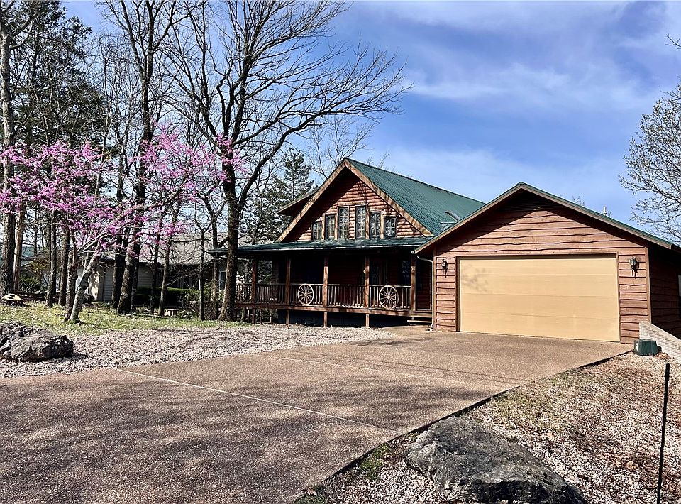 Cozy log cabin home with beautiful views of Table Rock Lake. This home features a 2 car garage, wrap around decks, double sided fireplace, sunroom, 2 living rooms, sitting area with built ins just outside the primary suite, new HVAC system in Feb. 2025. Holiday Island assessment fees due yearly. This property is sold as is.