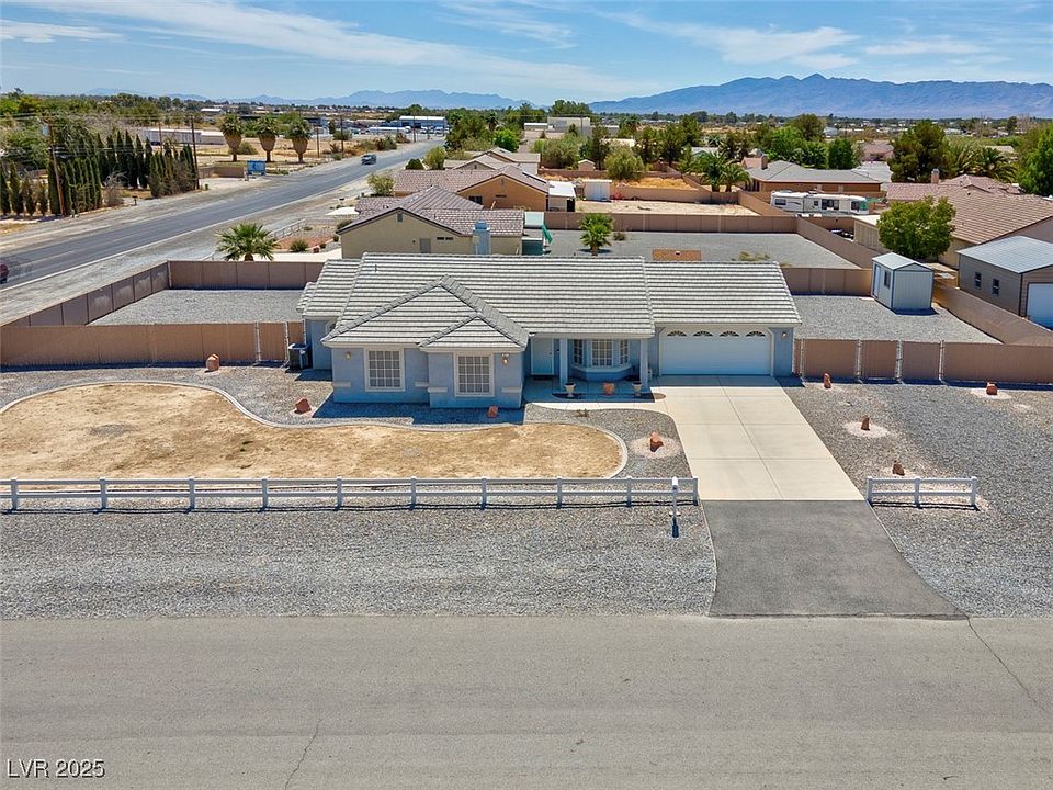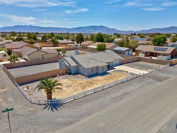 Nestled on an oversized 15,000+ sq ft corner lot, this charming single-story home offers breathtaking mountain views with endless potential. Step inside to a warm and inviting living room, complete with a cozy fireplace that's perfect for those chilly desert evenings. The open layout ensures you'll always feel right at home. 3 spacious bedrooms and 2 bathrooms. The backyard is a treasure trove of possibilities with ample space for RV parking, a playground, shop, or garden. A shed provides excellent outdoor storage. Discover the potential of this Pahrump gem today!