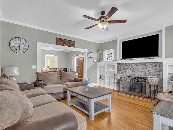 The cozy living room has a stone fireplace and built-in shelving. It flows into a separate dining room and into the kitchen. Down the hall, you'll find two good-sized bedrooms and a full bath.
