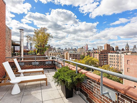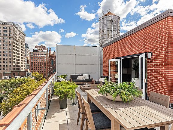 Perched atop an elegant, converted pre-war condominium, beautifully renovated and complete with a full-time doorman on the best block in the heart of Greenwich Village, this gorgeous duplex penthouse is an extremely rare find. Enter through a gracious foyer that leads to the expansive living room with beautiful open Village views and superb light. A beautifully milled classic kitchen features walnut cabinetry, Calacatta Gold countertops, and Sub-Zero and Miele appliances you would expect of a property of this caliber. The primary bedroom suite features a classically contemporary windowed bathroom with a soaking tub, double-vanity sink, and an outstanding, large closet. On the opposite side of the apartment is a second bedroom suite with a full bath facing south. A stairway leads to what could be a third bedroom, office, or study with a wood-burning fireplace and a gorgeous half bathroom. There is also a kitchenette equipped with a sink, dishwasher, and a custom two-cabinet fridge/freezer. A set of French doors leads you out to a breathtaking private terrace that features elegant furnishings, a gas-lined BBQ, and dreamy Village views and sunlight. The entire apartment is finished with Bolivian Rosewood hardwood floors, ducted central air-conditioning, and attention to detail that is virtually impossible to find in a Greenwich Village condominium.