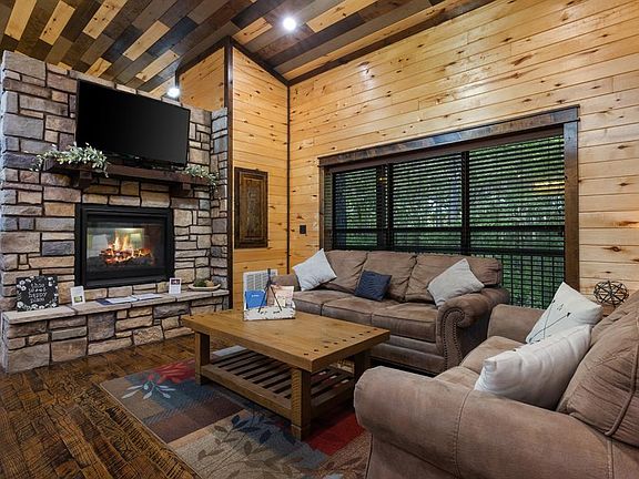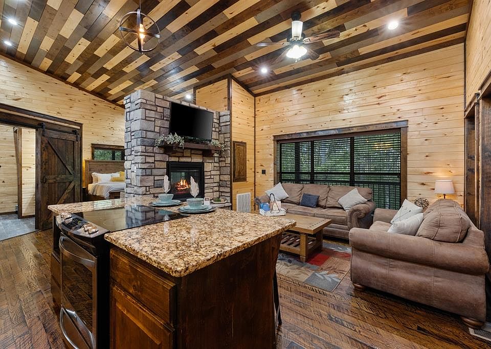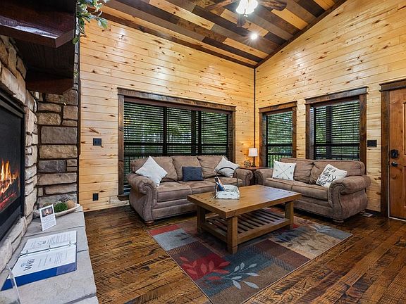 Nestled in a quiet, wooded setting and backing directly to National Forest land, this architecturally designed cabin offers the ultimate retreat in the heart of Hochatown. Thoughtfully laid out ot maximize privacy and flow, the home features a stunning multi shaded wood ceiling that draws the eye upward. A double sided stone fireplace serving both the living room and bedroom. Hand scraped hardwood floors throughout the main living area. Open kitchen with island, seamlessly merging with the living/dining zones. A luxurious bathroom with oversized walk in shower and a separate soaking tub. Wide, full length covered deck complete with a hot tub, outdoor fireplace, and plenty of space to lounge and entertain. Because the property borders National Forest, you have direct access to hiking, wildlife viewing, and the freedom of unspoiled views. The home is tucked back off the road, giving both solitude and convenience.