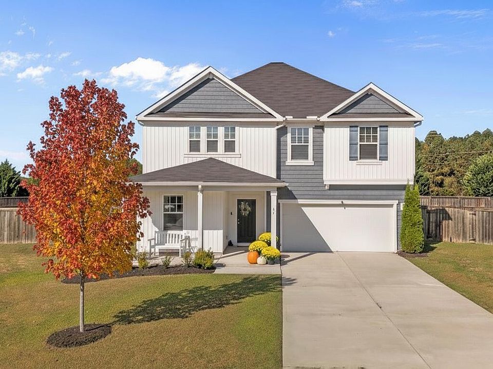 *$1000 of buyer's closing costs offered* From the time you walk onto the charming front porch, you feel a sense of being at home. Located at the end of a quiet cul-de-sac on over a 1/2 acre lot, the curb appeal of this home is welcoming. Inside, the foyer opens to a large family room, dining area and kitchen. The kitchen features granite counters, SS appliances and grey cabinets. The ample walk-in pantry and cabinets offer storage for all of your kitchen needs. A separate study/home office and large storage closet complete the downstairs. Upstairs, there is a versatile loft, perfect for a playroom or upstairs family room. The spacious primary suite offers room for a sitting area, a generous walk-in closet and upgraded primary bath with a double vanity, tiled shower and floor as well as a linen closet. Two additional bedrooms, a walk-in laundry room and another full bath complete the upstairs. Outside, enjoy the large, flat backyard from the screened-in porch and expanded patio. Just 12 minutes to downtown Fuquay Varina!