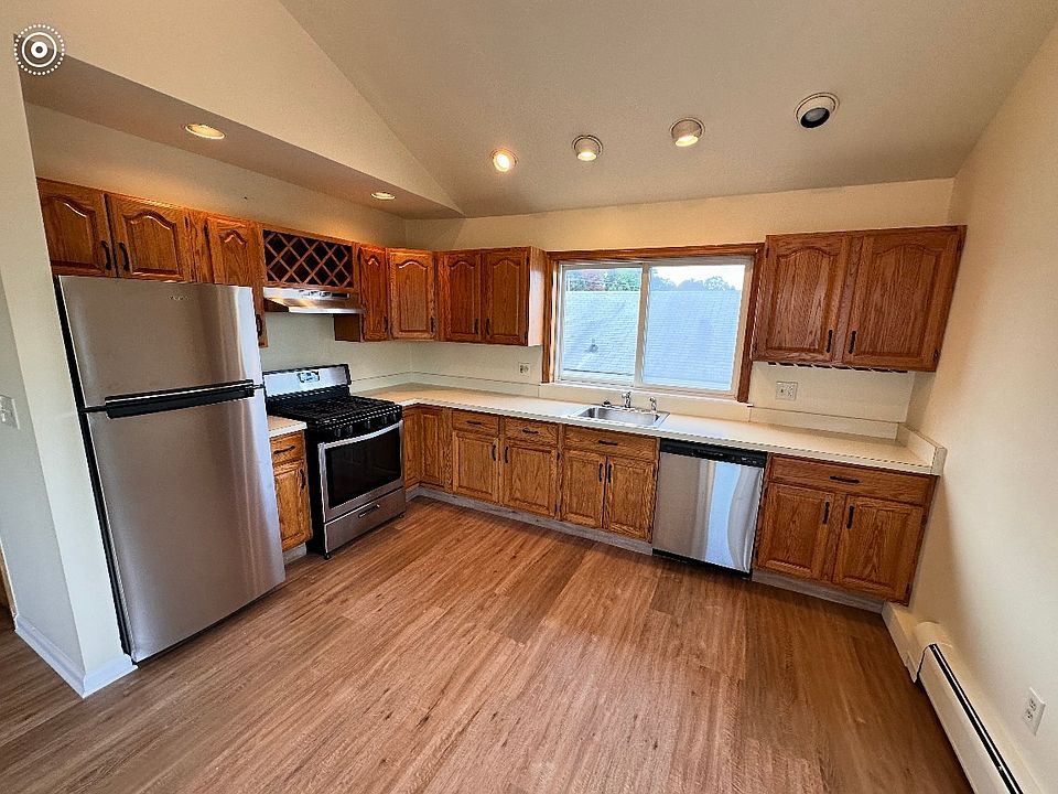 Eat in kitchenHardwood floorsStainless steel appliancesIn-unit laundry