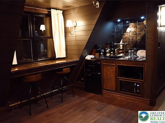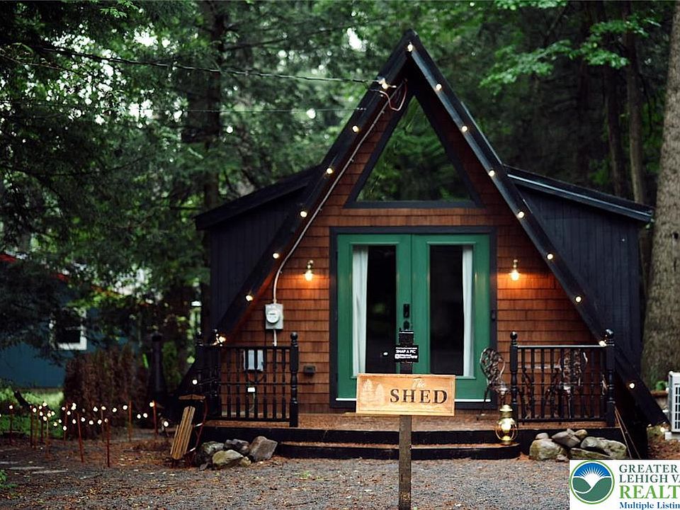 Don't miss your opportunity to be the next owner of 'The Shed', a fully operational, income-producing A-frame retreat tucked among the evergreens in desirable Pocono Pines. With no HOA and ultra-low taxes, this turnkey property is ideal as a short-term rental, personal getaway, or both. Impeccably updated with rich, moody finishes and set under soaring pines, this cabin blends modern comfort with timeless charm. Step inside to a warm, intimate interior featuring custom millwork, a stylish kitchenette with brass accents, cozy bedroom plus additional lofted sleeping space, and dining nook overlooking the trees. The dramatic black-tiled bathroom offers boutique-hotel appeal with checkerboard floors and warm lighting. Every detail has been curated to create a high-end cabin experience guests love. Outside, the magic continues. Follow the lit garden path to a private seating area with Adirondack chairs and a vintage chiminea for year-round fires. Enjoy the home's striking exterior with cedar shakes, green double doors, and string-lit trim that feels like a storybook escape. Ideally located just minutes to Kalahari, Routes 80 & 380, shops, restaurants, and year-round Pocono attractions. Strong rental history, excellent guest feedback, and offered fully furnished for a seamless transition. A rare opportunity to own a turn-key cabin with exceptional character and unbeatable carrying costs in one of the Poconos' most sought-after areas - schedule your private tour today!