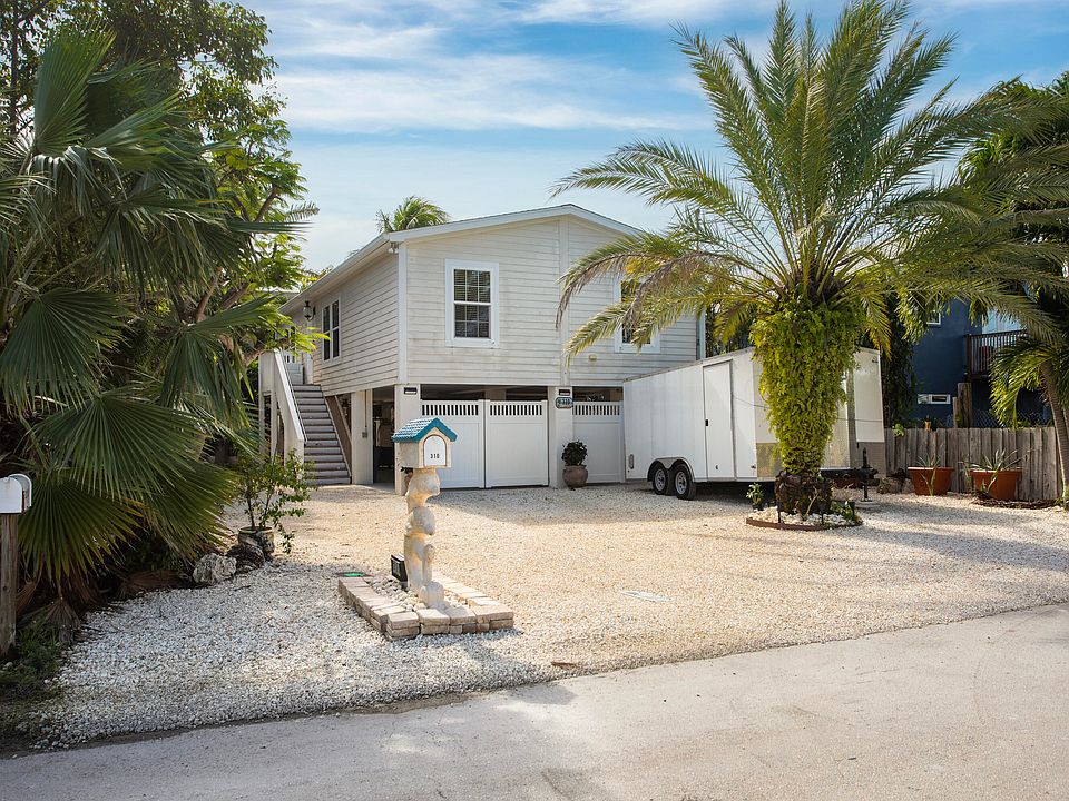Well maintained, elevated, single family modular home with pool & other upgrades can be yours. Three bed, 2 bath residence has split floor plan with primary bedroom in back & two additional bedrooms in the front (one with murphy bed to maximize space). New vinyl flooring in every room with no step downs (ie. no tripping hazards) accented with baseboard molding plus crown molding on vaulted ceilings. Kitchen boasts tile back splash, granite counter tops & all stainless-steel appliances including gas stove / oven. Both bathrooms have granite counter tops & primary has make-up station & linen closet. Impact windows on this elevated home keeps insurance costs low (currently less than $3,400 per year). Central AC compressor replaced in 2022. Yearly termite service contract just renewed. Stairs feature custom stainless-steel handrail & trex treads. Underneath home has finished ceiling with recessed lights, ceiling fan, TV, concrete slab which provides ground level, covered outdoor living / entertaining space, storage & covered parking. In the yard you have an above ground pool, ample parking for multiple cars & the majority is covered in stones & pavers. Landscaping features key limes, pineapples, mangoes, Tahitian gardenia, flowering jasmine, heliconia, royal poinciana, golden dew drops, hibiscus & multiple types of palm trees including Sylvester palm out front. CBS wall in rear yard & fencing on side afford you privacy for pool & patio. Seller says all adjoining homes are owner occupied. Community boat ramp nearby plus short drive into Key West. Enjoy and love this home as much the current owners did. Open House, Saturday Dec 10 from 11 to 1.
