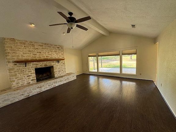 Beautiful rock fireplaceNew paintLarge windowsLarge walk-in closetNew tile tub surroundCovered back porchNew roof