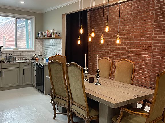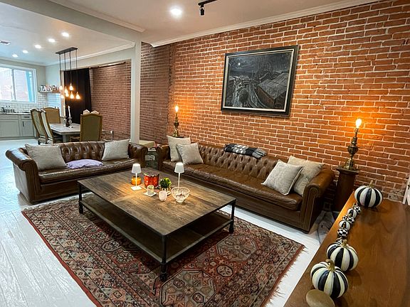 The open-concept living area showcases exposed brick walls, soaring ceilings, and a skylight atrium that floods the space with natural light in every room creating a warm, inviting atmosphere that feels both modern and historic.