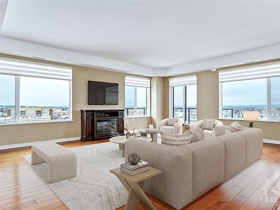 Orleans LUXURY PENTHOUSE condo in the sought after Celestia building. Approx 1565sq ft. open concept corner unit with exceptional views of the Ottawa river and Gatineau Hills. Spacious entrance w/double closet, high end kitchen w/SS appliances, granite counters & island overlooking eating area & living room w/tons of windows bringing in natural light. Incl. 10ft ceilings & gleaming hardwood floors throughout, access to your own private balcony off LR & primary room. Large primary bedroom w/luxurious 4 pc ensuite, good size secondary bedroom, full bathroom and large in-unit laundry room w/storage. All-cement building for ultimate privacy & quietness w/oversized underground parking (12'x16') w/220V plug + one (1) outdoor surfaced park, climate-controlled storage locker just a few steps from your door & an impressive rooftop terrace including barbecue, loungers + dining area. Walking distance to Shenkman Art Centre, shopping, restaurants and transit. Copyright Ottawa Real Estate Board (OREB). All rights reserved. Information is deemed reliable but not guaranteed.