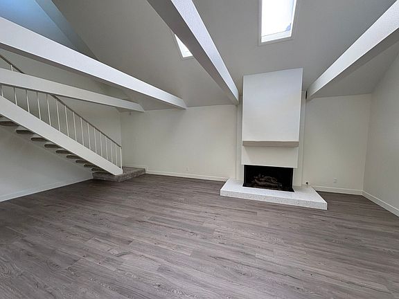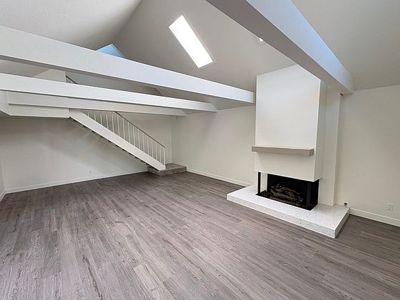 * Bright, airy living room with soaring beamed ceilings, new hardwood LVT floors, a contemporary gas fireplace with tile hearth and mantle, multiple windows providing lots of natural light and sliding door to enclosed courtyard.