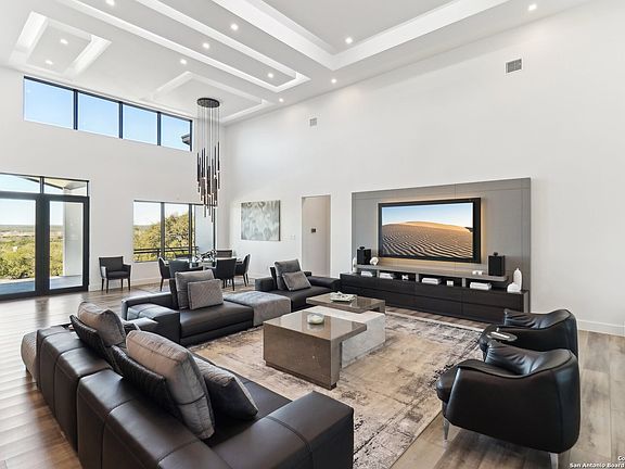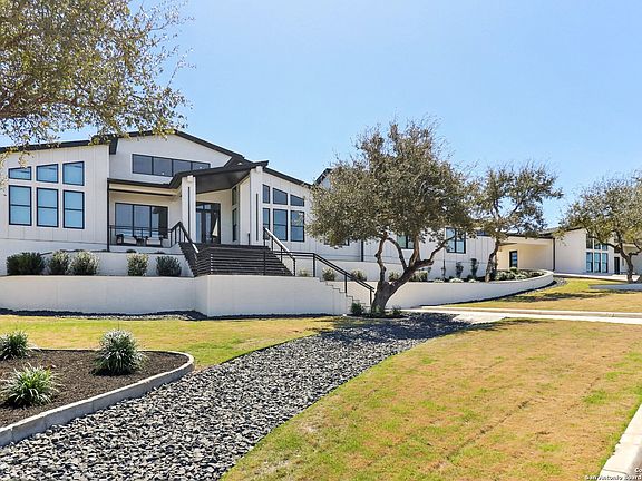 Exquisite Custom Home with Hill Country Views. Discover this stunning, privately gated one-story luxury custom home, offering 5,121 sq. ft. of meticulously designed living space on 2.03 serene acres. Nestled in a tranquil gated community, this property boasts breathtaking hill country views, combining elegance and comfort in a picturesque setting. Features You'll Love: Spacious Living: The open-concept living room with soaring custom 20 foot backlit ceilings flows seamlessly into a chef's kitchen, perfect for entertaining or indulging your culinary passions. Primary Retreat: The expansive primary suite features a spa-like HIS and HER bathroom, complete with an extraordinary porcelain steam shower for ultimate relaxation. Car Enthusiast's Dream: A 6-car garage/shop, including a dedicated RV garage with hookups, provides unmatched convenience and storage. Outdoor Oasis: Entertain effortlessly with an inviting pool, waterfall, and a versatile covered outdoor space. Drop the shades for a cozy, indoor-outdoor vibe, ideal for hosting unforgettable gatherings. Recreation at Home: Enjoy a quick game on your private lighted pickleball/basketball court along with outdoor pool/ping pong table, adding to the home's unique lifestyle amenities. This property offers a rare combination of luxury, privacy, and functionality with easy access to the beauty of the Texas Hill Country. Don't miss your chance to own this one-of-a-kind retreat-schedule your private showing today!