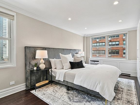 This bright, renovated, and expansive two-bedroom, two-bathroom property boasts high-end finishes, loads of natural light, hardwood flooring, recessed lighting, through-the-wall air conditioning, refined fixtures, custom built-ins, window treatments, crown and base moldings, with ample closets and storage throughout.