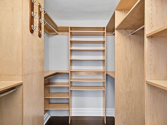 The king-size primary suite features two exposures (north/west) and is outfitted with custom closets, wall unit and storage, built-ins, window treatments, and recessed lighting throughout. The ensuite bathroom consists of a stall shower with a rainfall showerhead and horizontal accent tile. The second bedroom includes custom built-ins, window treatments, and a large closet. The second bathroom features a cast iron bathtub, pedestal sink, and decorative tiles.