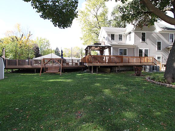 This wonderful home boasts a welcoming front porch, an open concept living and dining area, and a well-equipped eat-in kitchen featuring modern appliances, cabinets and a large breakfast bar. The spacious family room with a stone fireplace and bay windows adds a cozy touch. The second level includes four bedrooms, each with ceiling fans, and a luxurious owner's suite with a walk-in closet and a bathroom complete with a separate shower and whirlpool bathtub. One of the bedrooms offers a balcony overlooking the pool. Ample storage in the attic enhances functionality, while the basement offers additional recreational space, storage options, a potential fifth bedroom, and laundry facilities. Outside, the large composite deck is perfect for entertaining, complemented by a gazebo and pool. Practical features include a two-car garage, a shed, dual furnaces and AC units, a tankless water heater, newer gutters, and new entry doors. The home is being sold as-is, which may attract buyers looking for a spacious family residence with numerous amenities.