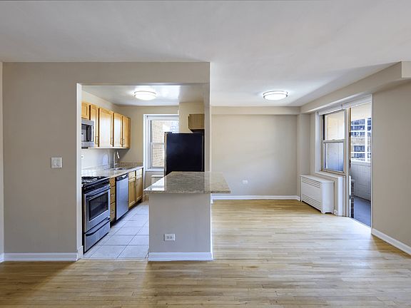 The kitchen features sleek stainless steel appliances, including a built-in microwave and dishwasher, making meal prep and cleanup a breeze. Hardwood floors run throughout the apartment, and generous closet space ensures you have plenty of room for storage and organization.