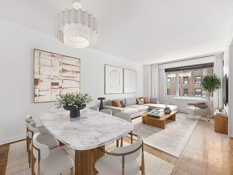 Flooded with eastern light, the expansive living room enjoys picturesque views of Lexington Avenue and easily accommodates a full living set and dining for eight. Warm parquet hardwood flooring runs throughout.