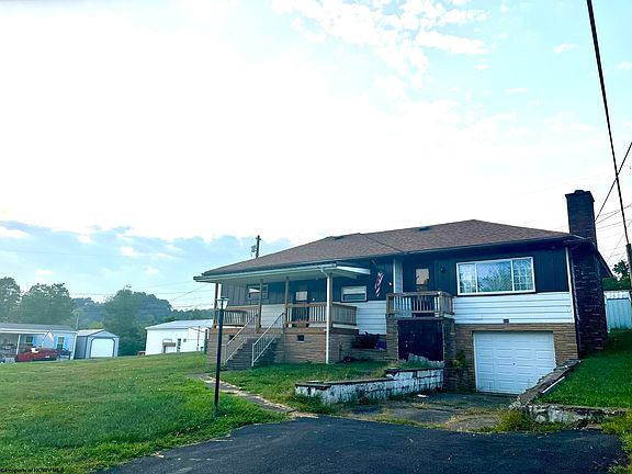 Excellent Value! Discover this attractive raised-ranch featuring approximately 1,500 sf on the main level, plus a spacious full basement with access from the integral garage. Enjoy the level-to-gently sloping lawns of this corner lot of 0.35 acre with ample parking at the front and rear plus storage buildings. Step inside to an inviting living room, complete with a cozy wood-burning fireplace, large windows, and a balcony that overlooks the front lawn. The split-bedroom layout includes three bedrooms with hardwood floors. The bright, fully equipped kitchen flows seamlessly into a generous dining room, with additional space for a second adjacent dining area toward the rear of the home. Energy-efficient vinyl double-pane windows throughout, and electrical outlets have been updated throughout the main level. Stay comfortable year-round with a high-efficiency Carrier furnace and central air conditioning. The water heater was replaced in 2022,