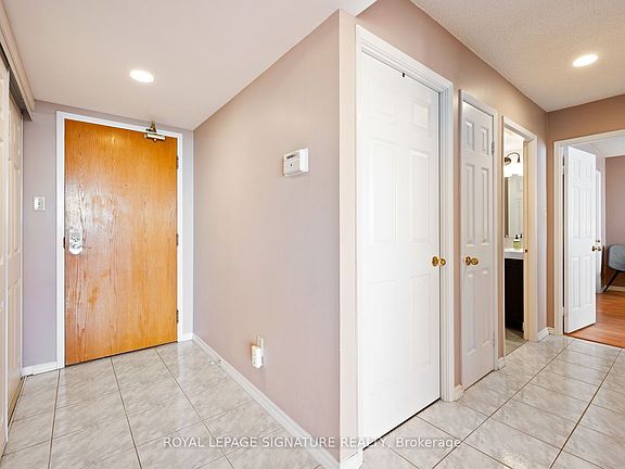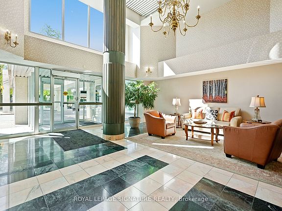 TOP-FLOOR LIVING AT ITS BEST! This bright and spacious 2-bedroom suite with a solarium comes complete with two owned parking spaces and a storage locker. Enjoy the peace of mind of 24-hour security and the convenience of all utilities included in the maintenance fees. The open-concept living and dining area features a neutral palette, crown moulding, and pot lights, creating a welcoming and versatile space. The kitchen showcases granite countertops, stylish backsplash, and tile flooring. The solarium, accessible by double French doors, is filled with natural light and makes an ideal home office or den. The primary bedroom boasts a walk-in closet and a 3-piece ensuite with a modern vanity and frameless glass shower, while the second bedroom is generous in size and positioned beside the solarium. A 4-piece main bath offers an updated vanity, tile floors, and contemporary finishes. Added features include in-suite laundry and a double front hall closet. Residents can take advantage of the many amenities this building has to offer, with fees covering heat, hydro, water, A/C, parking, insurance, and more!